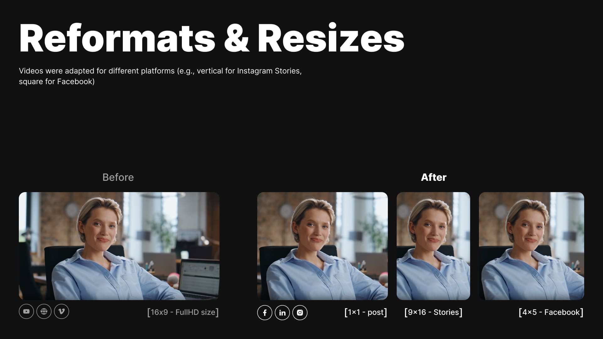 Sometimes, this can be overlooked, and then when it’s time to deliver the final video, everybody figures out that there’s a need for other resolutions (like 9:16, vertical phone format) or cutdowns and shortened video versions.