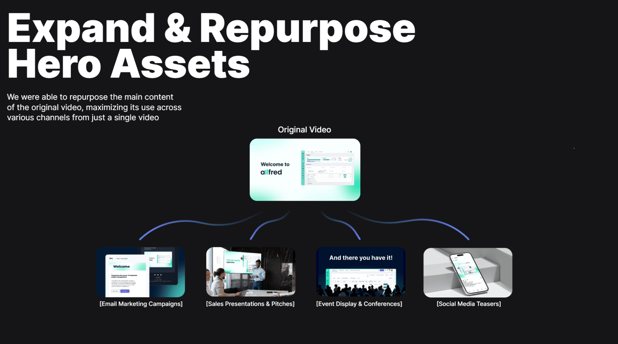 As we’ve built the full funnel for our SaaS project management solution Alfred – we’ve made sure to adapt the video content to work across email, pitch decks, gifs, and feature pages.